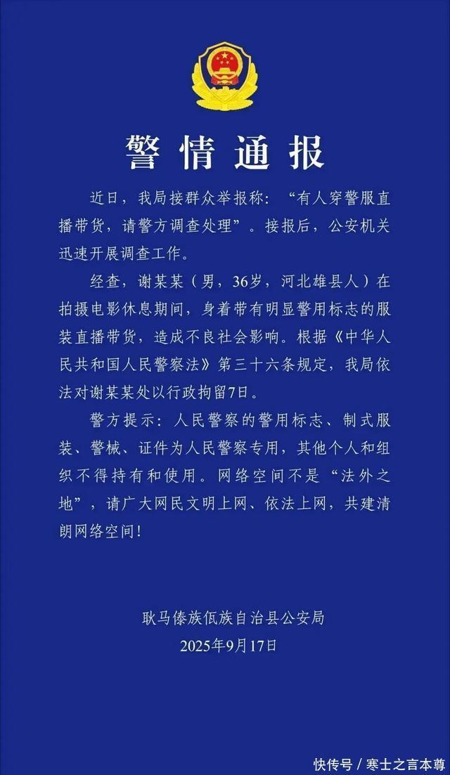 9月17日,云南警方发布警情通报, 称“嘎子哥”演员谢某某(男,36岁,河北雄县人)在拍摄电影休息期间,身着带有明显警用标志的服装直播带货,造成不良社会影响,决定对其行政拘留7日。 同时提醒:人民警察的警用标志、制式服装、警械、证件为人民警察专用,其他个人和组织不得持有和使用。